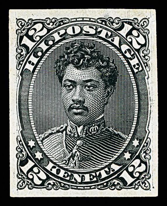 1875, Prince William Leleiohoku, 12¢ black, plate proof on India paper (Scott 36P3), deeply engraved yielding profound color and clear detail, full margins all around; small thins, pinhole along outer frame line above "T" of "POSTAGE", Very Fine appearance. Scott $400. (Image)