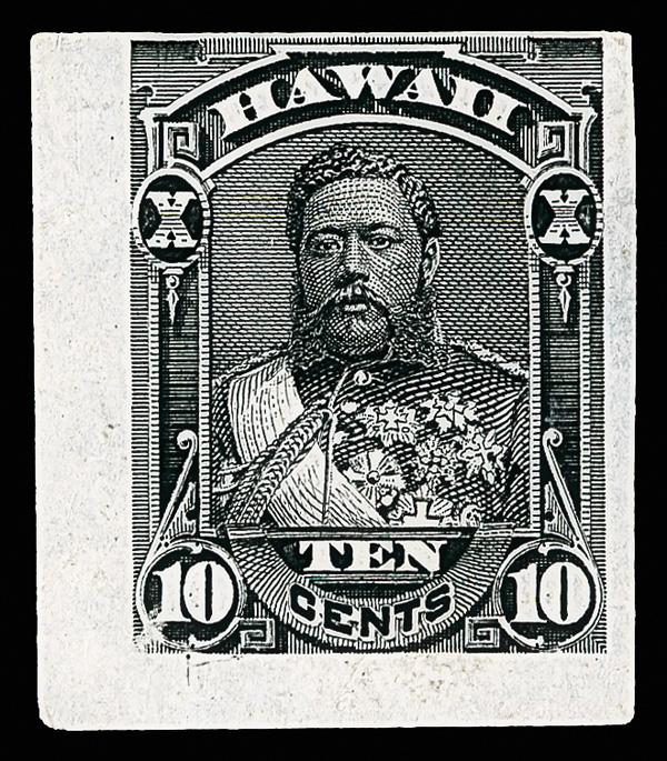 1882, King David Kalakaua, 10¢ black, plate proof on India paper (Scott 40P3), nice positional, wonderfully fresh with intense color on immaculate paper; small thins, Fine to Very Fine. Scott $400. (Image)