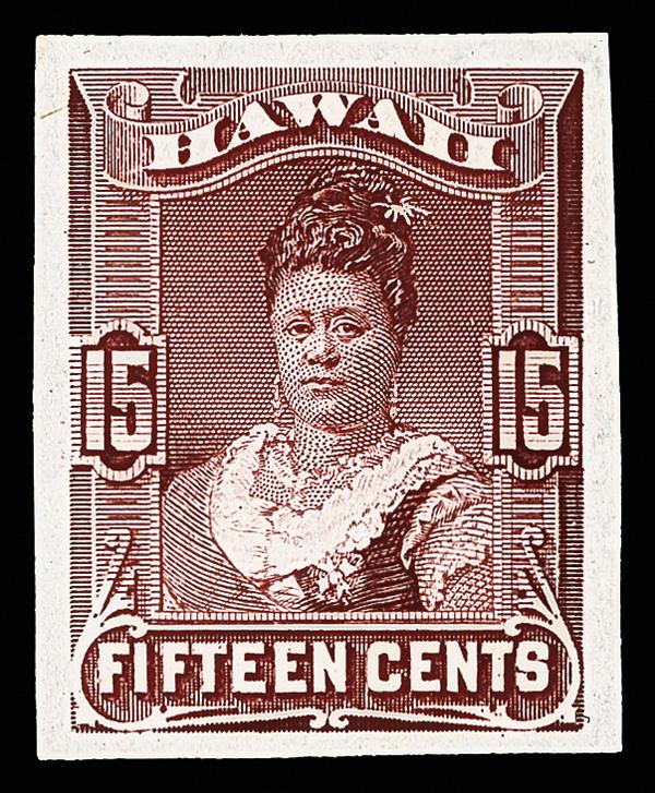 1882, Queen Kapiolani, 15¢ red brown, plate proof on India paper (Scott 41P3), crisp, clean impression on like-new India, Very Fine. Scott $400. (Image)