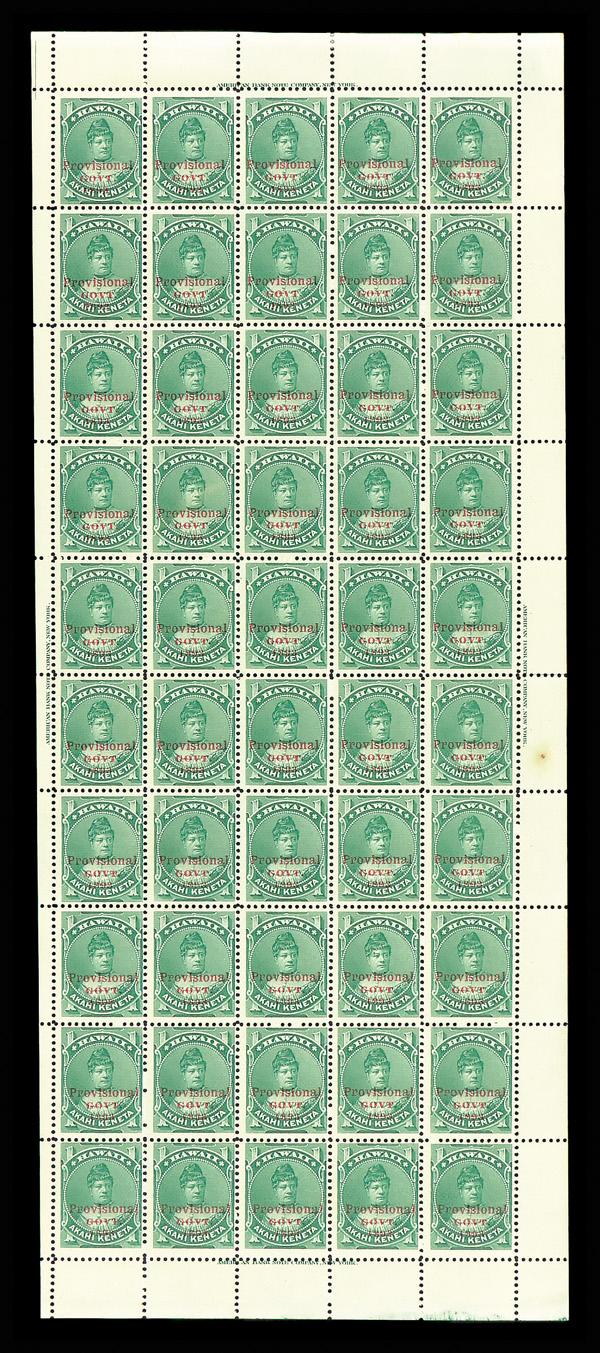 1893, Provisional Govt., 1¢ green, red overprint (Scott 55), full pane of 50 with American Bank Note Company imprint in each selvage, o.g., never hinged, crisp impression in light, fresh color; toned spot in right selvage not affecting stamps, Fine to Very Fine, with 2019 P.S.E. certificate. Scott $200 as singles. (Image)
