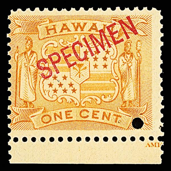 1894, Coat of Arms, 1¢ yellow, "SPECIMEN" overprint in red (Scott 74), position UL47, bottom margin single with part imprint, o.g., never hinged, pretty positional with bright, unblemished color; clean overprint and security punch at lower right, Fine, unpriced in Scott. (Image)