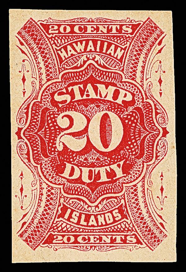 Revenue, 1894, 20¢ red, imperf (Scott R9a), o.g., never hinged, cleanly printed in crisp color, well centered; faint, even overall toning; one circular gum skip (bubble?), Very Fine nonetheless, not often encountered. Scott $1,200. (Image)