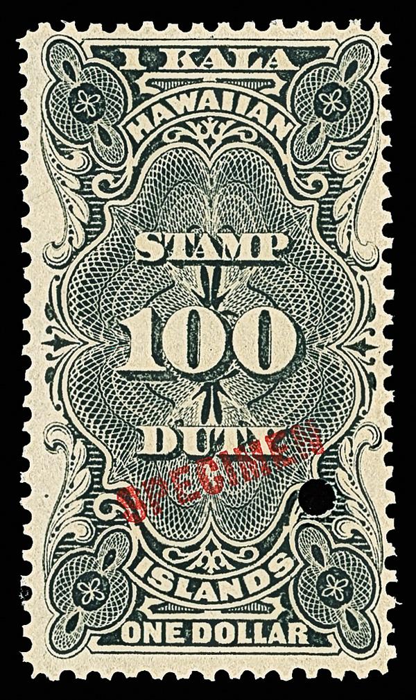Revenue, 1913, $1 black, "SPECIMEN" overprint in red (Scott R14), position 38, o.g., never hinged, sound and fresh with crisp color and clarity, security punch below "N" of overprint, Very Fine. (Image)