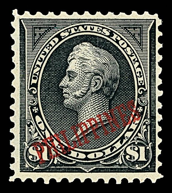 1901, $1 black, type II (Scott 223A), o.g., never hinged, Post Office fresh and sound with intense color and sculptural presentation, Very Fine, a rare stamp never hinged; consignor notes only eight known, with 2014 P.S.A.G. certificate. Scott $5,000. (Image)