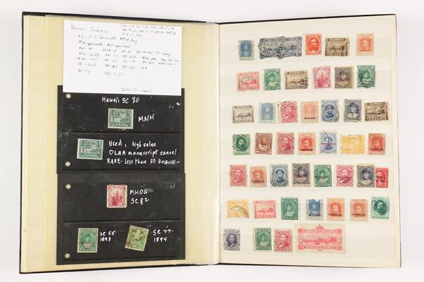 Hawaii, You Can Almost Hear the Surf, 1892-1959, Lighthouse stockbook with mint and used with wide range of condition; includes #72b no period unused still on auction card (Hawaiian Philatelic Society cert), 82 MH, 55, 77, 80 MNH, incoming 1948 registered mail from Uruguay, 1896 town cancel from Maui to Honolulu, Hawaiian Clipper mail (1937) with Special Delivery, 1934 Registered envelope from India to Honolulu, 1936 Southern Rhodesia to Wawaii with Postage Due, #21 5¢ numeral with Hawaiian Philatelic Society cert, and more; exotic, Fine to Very Fine. Shipping charges apply - weight 2.4 lbs. (Video for this lot) (Image)