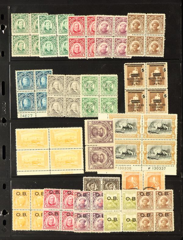 Philippines, Mint & Used Holding on Stock Pages, 1856-1950s, One binder of stocksheets with a thorough handling of the Spanish Dominion with some imperf proofs, telegraph stamps and revenues, and a strong offering of the U.S. Administration including blocks, some with plate number, such as #394 & 431, booklet panes, like 291b (both mint & used), and some better B-O-B, overall Fine to Very Fine, viewable in its entirety online. Shipping charges apply - weight 2.6 lbs. (Video for this lot) (Image)