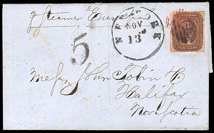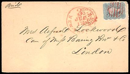 1860, 24¢ gray lilac. An exceptionally fresh and decently centered single, cancelled by fresh red grid cancel on attractive cover to England, postmarked bold red "New 3 York Am Pkt Paid" cds, red London receiver, Very Fine and attractive, Choice cover, Scott Cat. $1,000. Scott No. 37; Estimate $300 - 400. US$300-400 (Image)