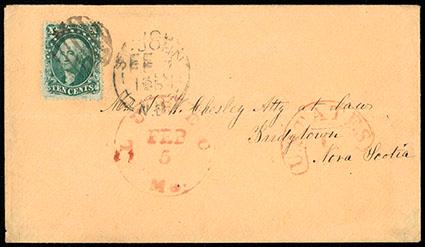 1852, 3¢ dull red, type II. Cut in, tied by "New York Feb 18" cds on 1853 cover to Canada unaccepted for partial payment with blue manuscript "10", bold strike of "Ud, States 6d" exchange straight line handstamp alongside, cover forwarded to "Lockport" (N,Y), Queenston backstamp, partial backflap and minor cover stain lower left, Very Fine and unusual. Scott No. 11A; Estimate $100 - 150. US$100-150 (Image)