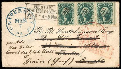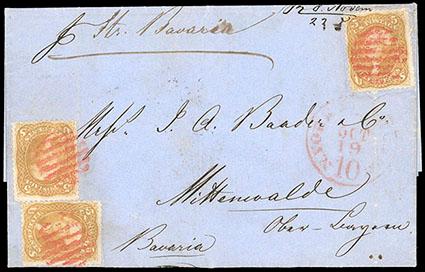 1861, 5¢ brown yellow, three singles. On 1861 folded letter to Mittenwalde, Germany, canceled by red grid handstamps tying stamps at left with stamp at upper right tied by manuscript docketing, matching "N. York Hamb Pkt, Paid 10, Oct 18" transit cds, reverse with Hamburg transit date stamps; light file folds affecting two stamps, otherwise Very Fine, a rare transatlantic usage of the 1861 5¢ brown yellow issue. Scott No. 67a; Estimate $1,000 - 1,500. US$1,000-1,500 (Image)