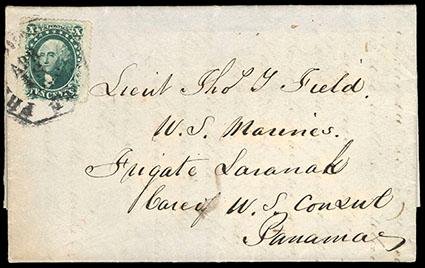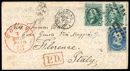 1861, 1¢ blue + 10¢ green. Wonderful correspondence to and from Boston to Florence, Italy, composed of forty United States covers and seventeen covers from Florence with frankings from Tuscany, the majority of the United States covers are franked with 1¢ + 10¢ pairs of the 1861 Issue, however we do note one cover franked with 1¢ + 5¢ + 15¢, one with 3¢ pair + 15¢ and one cover of the correspondence originating from Cleveland franked with 30¢ 1861, also noted is one cover with United States franked with 1¢ + 10¢ pair to Florence and forwarded to Rome with Italian 20c overprint, the 17 covers of Tuscany are all franked with the 1851-52 1cr + 9cr strip of 3 Lion Issue used in 1855, various different cancels, most all with original enclosure, also included is four Tuscany covers & two US covers missing stamps, the condition is mixed with some covers with edge wear, US stamps with perf flaws and Tuscany stamps with varying margins, however many very nice covers are present, please see our website for images, F.-V.F. Scott No. 63 + 68; Estimate $7,500 - 10,000.