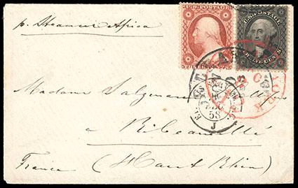 1857, 12¢ black, plate I. Tied on small cover with 1857 3¢ Dull Red (tiny perf flaws at top) paying 15¢ rate to France, all tied by "New Orleans, La, Nov, 30, 1858" cds and red New York transit cds's, appropriate French transit and receiving backstamps, manuscript "per Steamer Africa", Very Fine and extremely attractive cover. Scott No. 36; Estimate $200 - 300. US$200-300 (Image)