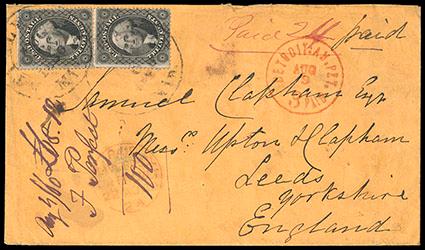 1857, 12¢ black, plate I. Two singles on cover to England, tied by indistinct Stillwater, Min, cds's, red "Detroit AM Pkt Paid 3" transit, additional red Liverpool transit cds, manuscript "Paid 24", vertical manuscript docketing at left, appropriate Leeds receiving backstamp, Fine, Scarce Detroit marking. Scott No. 36; Estimate $100 - 150. US$100-150 (Image)
