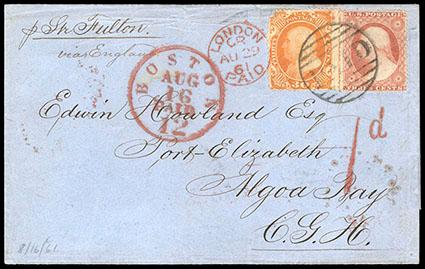 1860, 30¢ orange. Right straddle pane single showing vertical guideline and portion of adjacent stamp from other side of pane, in combination with 1857, 3¢ dull red (26) on folded letter sheet to Port Elizabeth, Cape of Good Hope, tied by neat large "Paid" in grid handstamp, bold red "Boston, Paid 12, Aug 16" exchange cds, 30¢ additionally tied by red "London, Au 29, 61" transit handstamp with matching large red "1" British Colonial credit marking, reverse with red Cape Town arrival and oval Port Elizabeth receiving backstamp; 30¢ with corner nick at top left, otherwise Very Fine, a scarce use paying the 33¢ rate by British Mails via Plymouth. Scott No. 38; Estimate $750 - 1,000. US$750-1,000 (Image)