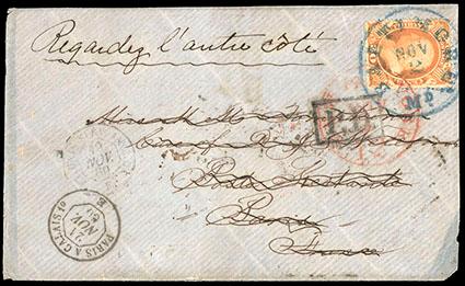 1860, 30¢ orange. Well centered and very fresh single on 1860 blue tissue paper cover to France, tied by both blue "Baltimore, Md, Nov, 2" cds and red "New York Nov, 3" transit cds, numerous transit & arrival markings, address crossed out and cover reused the Richmond, Va, addressed on reverse with Paris departure double circle postmark and black "Boston Dec, 6 30" debit cds, small cover corner fault and minor reduction at right, Fine, a very unusual usage, a detailed analysis can be found in Hargest's book. Scott No. 38; Estimate $300 - 400. US$300-400 (Image)