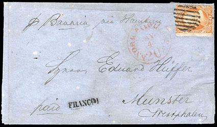1860, 30¢ orange. Minor edge flaws, tied on folded cover to Germany by open 7 bar grid, postmarked faint red "N, York Paid (Br) Pkt May 4" with integral "20", manuscript "P Bavaria via Hamburg", appropriate transits and receiving backstamps, cover faults, Fine appearance. Scott No. 38; $1,350; Estimate $150 - 200. US$150-200 (Image)