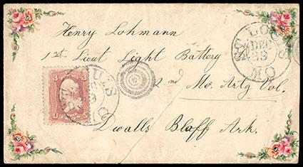 1861, 3¢ rose. Tied by "St. Louis, Mo., Dec 29" cds and target duplex on military addressed cover to Devalls Bluff, Ark., with skillfully executed hand painted floral bordering in corners, with original 1863 enclosure with additional elaborate hand painted floral letterhead (letter in German); cover with natural paper fold extending from bottom center of cover, Very Fine and attractive, a wonderful hand painted cover & enclosure. Scott No. 65; Estimate $300 - 400. US$300-400 (Image)