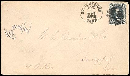 1866, 15¢ black, plate proof on card. Shaved down and perforated, then fraudulently used on a registered cover from South Meriden to Bridgeport, Ct; tied by quartered cork cancel alongside a South Meriden c.d.s., Oct 1, 1897; backstamped Bridgeport on Oct 4, Very Fine and most unusual, with 1987 P.F. certificate. Scott No. 77P4; Estimate $200 - 300. US$200-300 (Image)