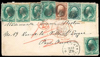 1867, 10¢ green, E. grill. Single on cover to Paris France, additionally franked with 1871 2¢ (146) and 3¢ (147, x6 singles) and paying the double 15¢ rate, all with identical cork cancels and centrally struck, originating with possible Weymouth Mass cds, Boston and New York red Transits, other appropriate but indistinct transits and receiver, a few small stamp or cover flaws/faults, Fine, unusual cover with nice combination of issues. Scott No. 89; Estimate $100 - 150. US$100-150 (Image)