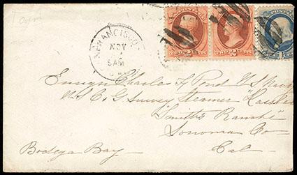 1875, 2¢ vermilion, C.B.N.C. printing, horizontal pair. In combination with 1879, 1¢ gray blue (182) on cover addressed to U.S. Navy Ensign aboard the U.S.C.G. Survey Steamer "Hassler" near Smith's Ranch, Cal. off the coast in "Bodega Bay", all tied by grid handstamps with matching "San Francisco, Cal., Nov 12" cds alongside; cover reduced at right into 1¢, Fine, the "Hassler", a United States Coast Survey schooner, was the first iron-hulled steamship used in the service of the U.S. Coast Survey. Scott No. 178; Estimate $100 - 150. US$100-150 (Image)