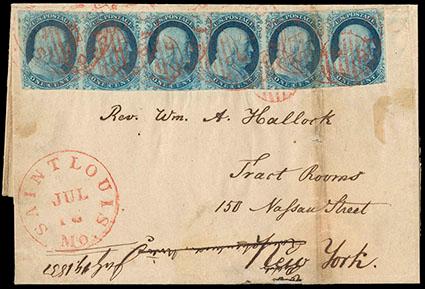 1851, 1¢ blue, type II, horizontal strip of six. Plate 1E. Margins full to just in at bottom right, tied by red circular grid handstamps on folded letter sheet to New York, matching "Saint Louis, Mo., Jul 18" cds, 1851 docketing at bottom left; soiled vertical file affecting 5th stamp, Fine, a rare plate one strip of six usage used within the first month of usage. Scott No. 7; Estimate $1,000 - 1,500. US$1,000-1,500 (Image)