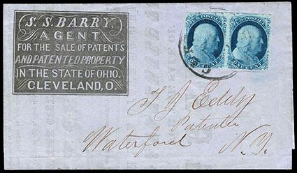 1851, 1¢ blue, types II & IIIa, horizontal pair. Plate 1E. Margins large to a bit in at bottom, deep color, tied by partial Cleveland, O. cds on "S.S. Barry, Agent For the Sale of Patents and Patented Property" black boxed corner card circular to Waterford, N.Y., Very Fine and choice, an attractive and scarce 2¢ domestic circular rate for distance over 500 miles, ex-Eubanks. Scott No. 7, 8A; Estimate $750 - 1,000. US$750-1,000 (Image)