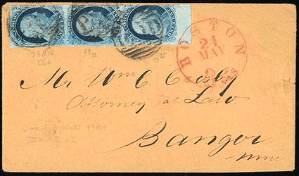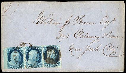 1851, 1¢ blue, types IIIa, II, II, bottom margin horizontal strip of three. Positions 79/89/99R1E. Margins large to in at right, deep color, tied by large "Paid" in grid handstamps on cover to Bangor, Me., additionally tied by red "Boston, 3cts, May 24" cds, with original 1853 enclosure; small cover tear at right, Very Fine. Scott No. 7, 8A; Estimate $400 - 600. US$400-600 (Image)