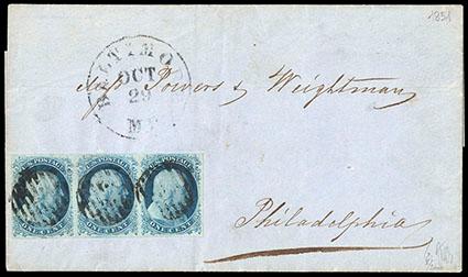 1851, 1¢ blue, type II, horizontal strip of three. Four full margins all around, tied by circular grid handstamps on 1851 folded letter sheet to Philadelphia, Pa., matching "Baltimore, Md., Oct 29" cds, Extremely Fine, a choice multiple on cover, with 2000 W. Jakubek certificate. Scott No. 7; Estimate $300 - 400. US$300-400 (Image)