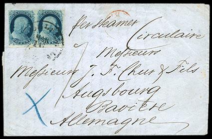 1851, 1¢ blue, type II, bottom sheet margin pair. Huge margins to just touched, on blue folded 1856 printed prices current to Augsburg, Bavaria, tied by "New Orleans La. Mar 16" cds, endorsed "Circulaire" at top, partial red French transit cds, manuscript "7" kr due rating, blue crayon "X", Ausburg (4.9) arrival backstamp, fresh and Very Fine circular rate use. Scott No. 7; Estimate $300 - 400. US$300-400 (Image)