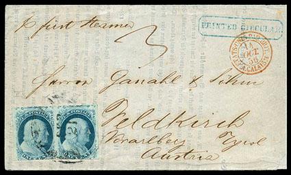 1851, 1¢ blue, type II, horizontal pair. Positions 18-19L2. Huge margins to in at bottom including significant portion of adjoining stamps at top, on blue folded printed circular to Feldkirch, Austria with company "Printed Circular" framed handstamp at top right, tied by "New Orleans La, Sep 21" cds, carried by Cunard Line Asia from New York Oct. 1st to Liverpool arriving Oct. 13th, red Calais (10.14) transit cds, "Feldkirch/17. Oct." two-line arrival backstamp and neat manuscript. "3" krCM due rating, Very Fine. Scott No. 7; Estimate $200 - 300.