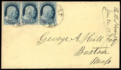 1851, 1¢ blue, type II, three singles. Plate 2, all with three large margins and cut in slightly at the top, tied by light "Woonsocket, R.I." cds's on small 1857 cover to Boston, Mass., 1858 docketing; reduced just a bit at the right, Very Fine. Scott No. 7; Estimate $150 - 200. US$150-200 (Image)