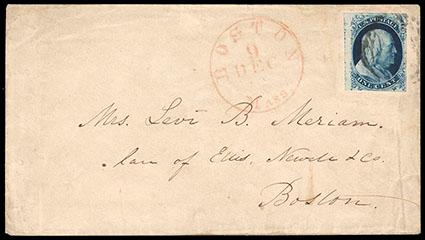 1851, 1¢ blue, type II, Plate 3. Margins huge to touching at bottom showing small portion of adjacent stamp at left, tied by a large "Paid" in grid handstamp on locally addressed cover, with red "Boston, Mass., Dec 9" cds alongside; some cover wrinkling, F.-V.F., with 2006 P.F. certificate. Scott No. 7; $550; Estimate $150 - 200.