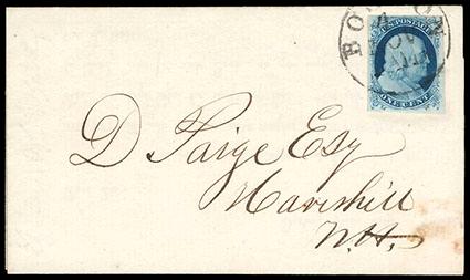 1851, 1¢ blue, type II. Position 3L1E, large margins except touched at bottom including sheet margin at top, pretty shade, tied by partial "Boston, Paid" cds on January 1852 printed circular to New York N.Y., Very Fine. Scott No. 7; Estimate $100 - 150. US$100-150 (Image)