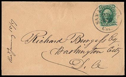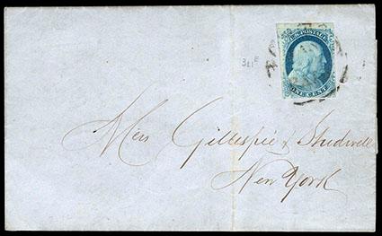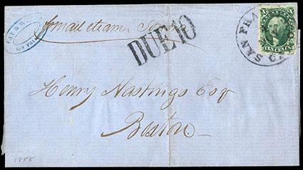 Noted philatelist Stanley B. Ashbrook regarded this and other 1851 Issue covers bearing the same October 1 postmark as "first day" uses from California. US$10,000-15,000 (Image)