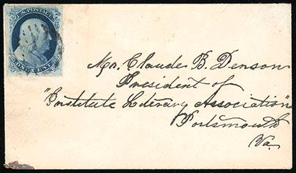1851, 1¢ blue, type III. Showing clear break at top and wide break at bottom. Large well balanced margins, tied by circular grid handstamp on ladies cover to the President of the Institute Literary Association in Portsmouth, Va., addressed redrawn in black ink not mentioned on certificate, otherwise Extremely Fine, a gem stamp on cover, with 1989 P.F. certificate. Scott No. 8; $1,900; Estimate $500 - 750. US$500-750 (Image)