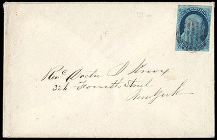 1851, 1¢ blue, type IIIa. Margins large to touching, tied by circular grid handstamp on New York locally addressed cover, Very Fine, with 1995 P.F. certificate. Scott No. 8A; Estimate $300 - 400. US$300-400 (Image)