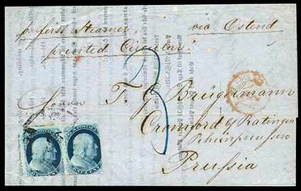 1851, 1¢ blue, type IIIa, horizontal pair. Positions 73-74R4. On blue folded printed circular to Cromford, Rhenish Prussia, tied by indistinct "New Orleans La. Sep 21" cds, endorsed "via Ostend" at top right, carried by Cunard Line Persia from New York Sep. 30th to Liverpool arriving Oct. 10th, red Calais (10.12) transit cds, Prussia blue manuscript. "3" sgr due rating, Oct. 14th arrival backstamp, a Very Fine use. Scott No. 8A; $2,250 as off-cover pair; Estimate $200 - 300. US$200-300 (Image)