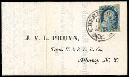 1851, 1¢ blue, type IIIa. Position 17R1E. Margins large to just touching at top left, tied by "Cherry Valley, N.Y., Oct 23" cds on 1851 railroad circular to treasurer of the U. & S. R.R. Co. (Utica & Schenectady Rail Road) in Albany; stamp with light margin toning not mentioned on certificate, otherwise Very Fine, with 2015 R. Doporto certificate. Scott No. 8A; Estimate $200 - 300. US$200-300 (Image)