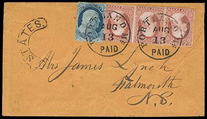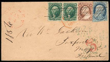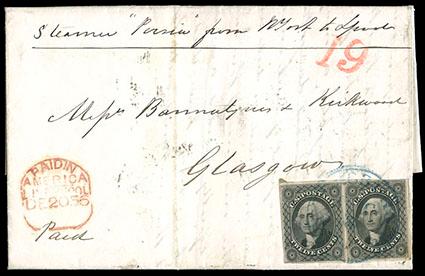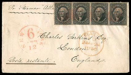 A RARE STRIP OF FOUR OF THE 1851 12¢ ISSUE PAYING THE DOUBLE 24¢ RATE TO ENGLAND. US$1,000-1,500 (Image)