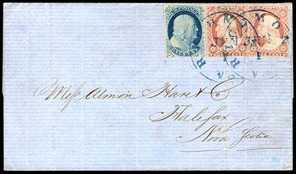 1852, 1¢ blue, type IV. Margins large to just touching at bottom, in combination with 1851, 3¢ dull red, two singles (11A) with mostly large to clear margins, tied by blue "Richmond, Va., Jun 1" cds's on folded letter sheet to Halifax, Nova Scotia, carried to Boston and transferred to a Cunard liner to New Brunswick with blue "St. Andrews, N.B., Ju 8, 1854" and "St. John, New Brunswick, Ju 9, 1854" transit cds and oval "H., N.S., Ju 13, 1854" receiving date stamp; 1¢ with tear at top and left 3¢ with light file fold crease, Very Fine appearance, an unusual 2¢ overpayment of the 5¢ rate via Boston and British packet. Scott No. 9; Estimate $500 - 750. US$500-750 (Image)