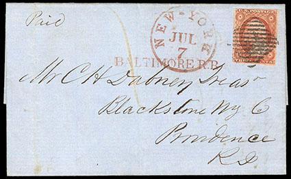 1851, 3¢ orange brown, type I. Margins ample to just in, faint crease, tied by 13-bar square grid handstamp (SD-G 93) on 1851 folded letter from Baltimore to Providence, R.I., with magenta "New York, Jul 7" cds alongside along with red "Baltimore R.R." straight line handstamp (PM-RR 4), Very Fine, a scarce Baltimore railroad usage of the 3¢ orange brown used during the first week of usage, with 2016 P.F. certificate. Scott No. 10; Estimate $400 - 600. US$400-600 (Image)