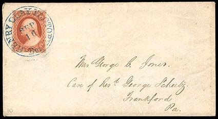 Use of Plate 5 is not known before July 19, 1851, so this is either an EKU or more likely a very late use of this orange brown plate given no stamps were supplied in the vicinity of this origin. However, it is a sharp impression from an early printing. US$300-400 (Image)