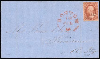 1851, 3¢ deep orange brown, type II. Position 87R5E. Margins large to slightly into framelines, tied by red small "Paid" in grid handstamp on fresh cover to Bristol, R.I., matching "Boston, 3cts, Jul 20" cds, Very Fine, a very early usage from plate 5, with 2008 P.F. certificate. Scott No. 10A; Estimate $150 - 200. US$150-200 (Image)