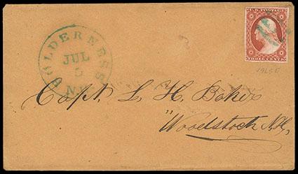 1851, 3¢ orange brown, type II. Position 19L5E, large margins all around include adjacent stamps at top and bottom, tied by bright green grid cancel, postmarked matching "Holderness N.H., Jul 5" cds on circa 1852 orange buff cover to Woodstock N.Y., Very Fine and choice green cancel use,ex-Allen. Scott No. 10A; Estimate $300 - 400.