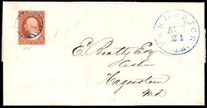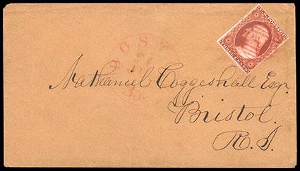 An exceptionally clear example of this plate 2 late orange brown shade, Allen notes on back. No other color even similar to this would appear until 1856. US$400-600 (Image)
