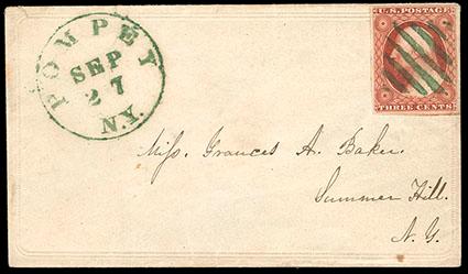 1851, 3¢ orange brown, type II. Position 48L5E, large margins to barely touched at top, deep rich color and early detailed impression, cancelled by deep green 6-bar square grid, postmarked matching Pompey N. Y. cds on lady's embossed cover to Summer Hill N. Y., Very Fine, a beautiful 1851 Type II 3¢ Orange Brown with green cancel. Scott No. 10A; Estimate $200 - 300. US$200-300 (Image)
