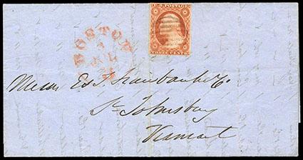 1851, 3¢ orange brown, type II. Position 7L1E from top row of plate. Clear to ample margins, canceled by circular grid handstamp on 1851 folded letter sheet to St. Johnsbury, Vt., red "Boston, 3, Jul 3" integral rate cds alongside; file fold creasing stamp along left edge, otherwise Very Fine, still an attractive first week of usage. Scott No. 10A; Estimate $150 - 200. US$150-200 (Image)