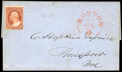 1851, 3¢ orange brown, type II. Position 9L1E from top row of plate. Top margin single with margins large to just into frameline at right, canceled by red small "Paid" in grid handstamp on 1851 folded letter to Jonesport, Me., matching "Boston, 3, Jul 21" cds, Very Fine, an early first month usage, ex-Chase. Scott No. 10A; Estimate $150 - 200. US$150-200 (Image)