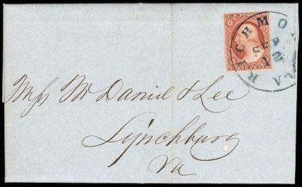 1851, 3¢ orange brown, type II. Position 95R2E, one line recut in upper left triangle. Clear to large margins and rich bright color, tied by neat blue "Richmond, Va., Sep 12" cds on fresh 1851 folded letter to Lynchburg, Va., Very Fine and choice. Scott No. 10A; Estimate $150 - 200. US$150-200 (Image)