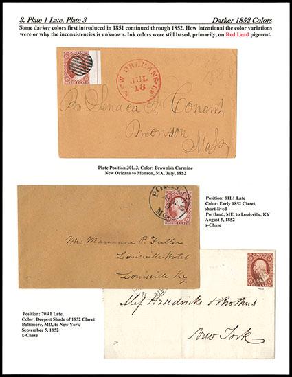 1851-52, 3¢ brownish carmine & claret, type II. Exhibit page with singles on three covers, each illustrating the new darker 1852 colors introduced; first, position 30L3, brownish carmine, large to barely touched with huge right centerline margin capture, canceled by black grid, red "New Orleans La. Jul 18" cds on orange cover to Monson Mass., signed by Amonette; second is position 81L1L, early 1852 claret color that was short-lived, large margins with part of bottom stamp except just in at bottom right corner, tied by bold "Portland Me. Apr 5" cds on orange buff cover to Louisville Ky., ex-Chase (a Chase color collection "varieties of color on cover" sold by Phillips, NYC, in 1950's in as a color example, mounted/protected since then), and third, position 70R1L, unusual very deep shade of the 1852 early claret, margins to barely touched, tied by light black grid, matching "Baltimore Md. Sep 5" cds on 1852 folded letter to New York City, vertical file fold, ex-Chase and plating (sold in same sale as second), an Extremely Fine trio. Scott No. 11A; Estimate $200 - 300.