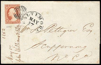 1852, 3¢ mid-1852 orange brown, type II, position 62R2L. Clear to large margins except into frameline at top right, distinctive shade, tied by black circular grid cancel and postmarked matching "Baltimore Md. May 17" cds on 1852 folded letter to Scuppernong N.C.; "1852" docketing, Very Fine,ex-Allen, with 2025 P.F. certificate. Scott No. 11A var.; Estimate $400 - 600.